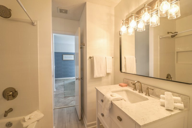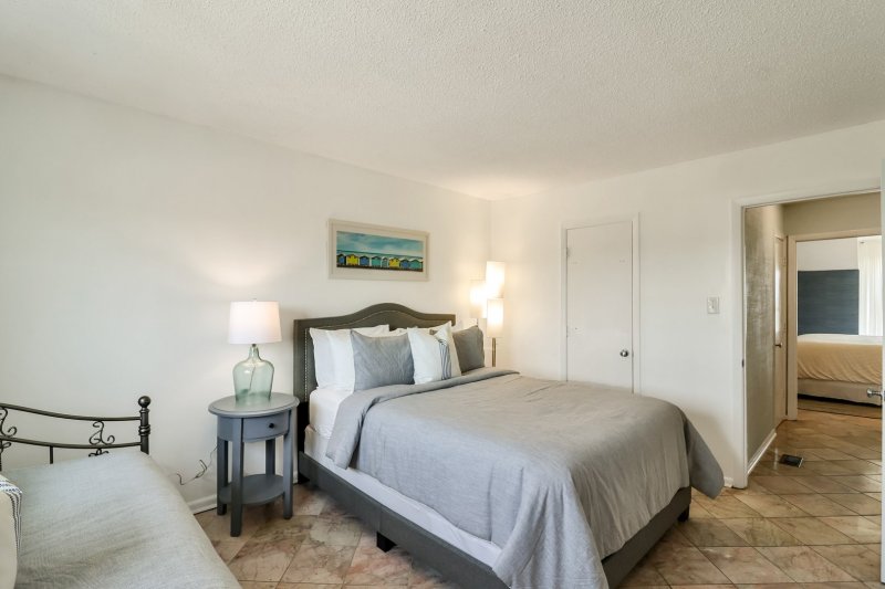 Upstairs, the primary bedroom features a king bed and sweeping ocean views—ideal for slow mornings and afternoon naps in the sea breeze. The second bedroom offers a queen bed and twin daybed with trundle, perfect for visiting family or friends escaping the winter chill. Both rooms share a full bathroom, creating a practical and comfortable setup for extended stays.