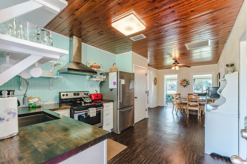 Inside, beneath vintage tongue-and-groove wood ceilings and flanked by waterside windows all around, four distinct shared spaces allow for families and friends to be together or to enjoy separate activities simultaneously. Solid surface flooring throughout makes these spaces kid, pet, and beach friendly!