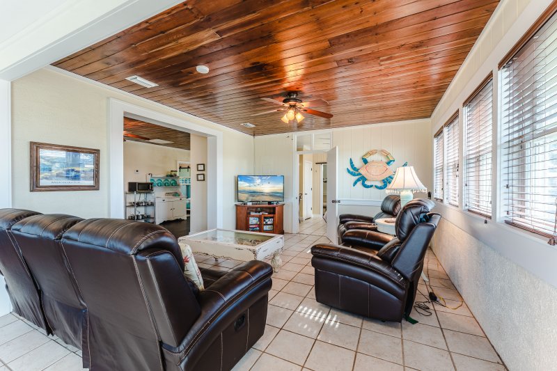 The den sports a huge 49" flat screen TV and comfy, leather recliners x 4! That's right, FOUR reclining spaces between the couch and two individual recliners, with comfortable seating for 5 and room for more! A wall of windows provides endless views of the water.