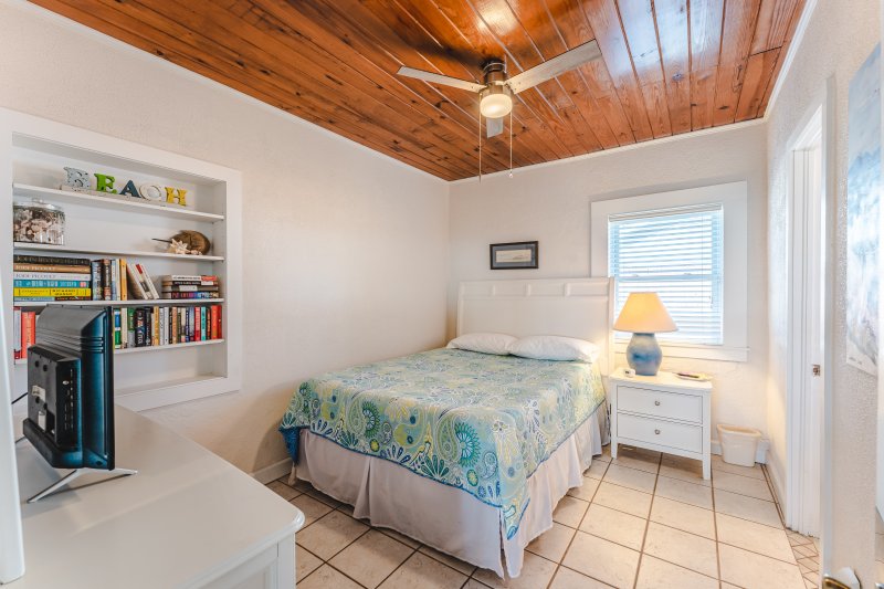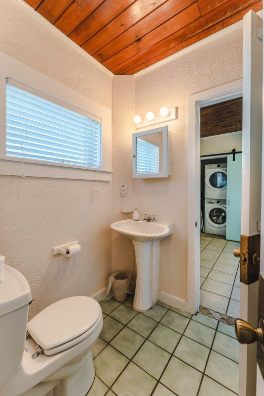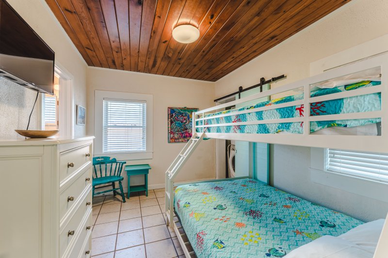 Across the home, jack-n-jill bedrooms flank an adorable truly period 2nd bathroom, with classic green tile and, yes, views of the ocean! One bedroom is equipped with a queen bed, built-in storage, chest of drawers, and smart, Roku-ready flat screen TV. The other bedroom flaunts a bright, beachy vibe! With a twin-over-full bunk, this room accommodates three and provides access to a new stacked washer and dryer.